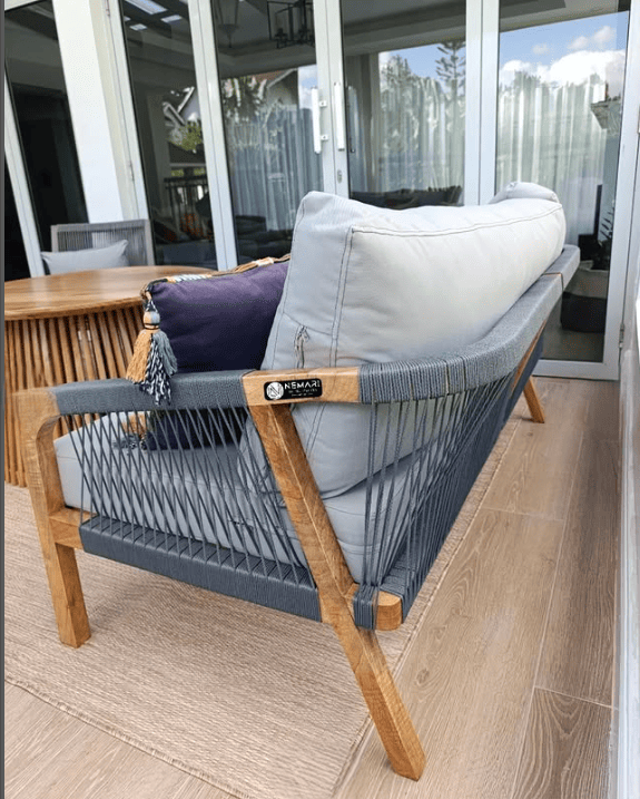 The Nova’s minimalist frame highlights the organic beauty of Meru oak, finished in a warm natural stain that complements its contemporary rope weave. Neutral-toned cushions add a refined softness, making it versatile enough to pair with any décor style — from relaxed coastal to sleek urban living.