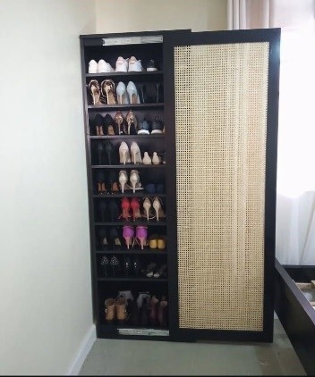 The standout feature is its smooth sliding door, framed in solid wood and accented with hand-woven rattan webbing. More than just a design detail, the rattan weave offers natural ventilation, keeping your footwear fresh while adding an airy, organic texture to the overall look. The sliding mechanism glides effortlessly on durable metal rails, ensuring both function and ease of use in busy households.