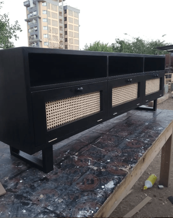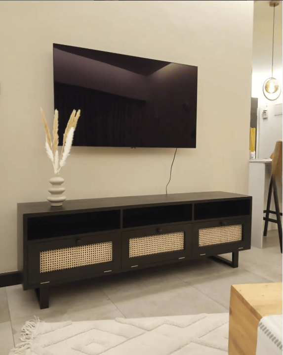 The Artisan Stand celebrates contrast — natural woven cane against a deep matte or satin black body, soft texture meeting sleek precision. The minimalist metal base, crafted with clean, tapered legs, anchors the piece with stability and poise. Every detail speaks of understated luxury, making it a perfect addition to living rooms, lounges, or entertainment areas.