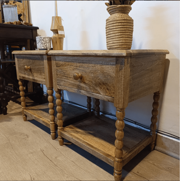 Each nightstand is handmade, highlighting the natural variations and unique grain patterns of solid mango wood. The spindle-leg detailing adds character and warmth, making every piece one of a kind. Whether placed beside your bed or next to a sofa, the Lamu Nightstands bring a touch of heritage-inspired beauty into your space.