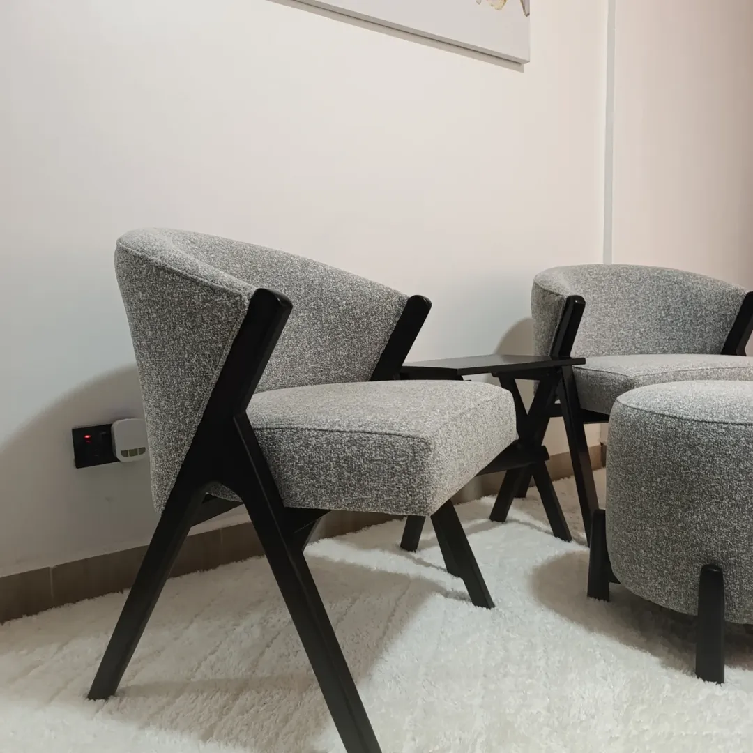 Perfect for living rooms, stylish office lounges, or chic hotel lobbies, Nova blends architectural presence with everyday comfort. Its bold black frame provides striking contrast against the plush heathered fabric, making it both a visual statement and a functional retreat.
