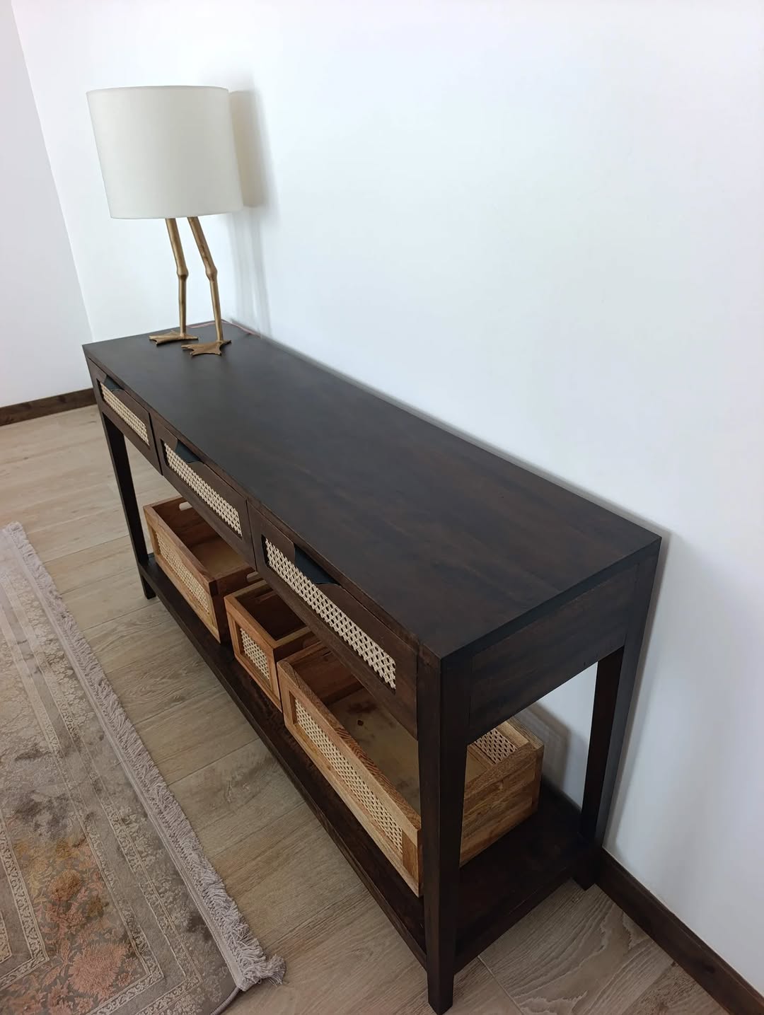The console’s three drawers glide effortlessly to provide discreet storage for everyday essentials, while the open lower shelf offers space for baskets, trays, or curated décor. The handwoven cane drawer fronts soften the black silhouette, infusing natural warmth and artisanal character into the sleek frame.