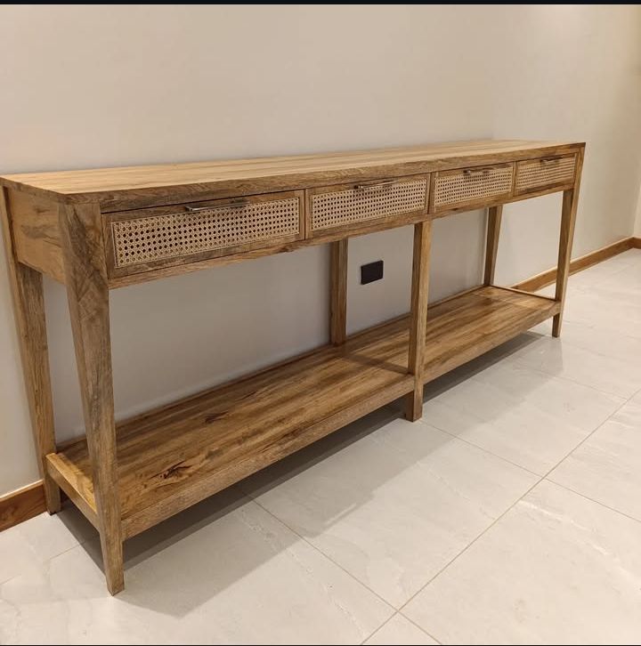 The Savanna Noir Console is a striking fusion of natural texture and refined sophistication. Handcrafted with a solid white oak frame finished in deep matte black, it exudes modern confidence while preserving the inviting warmth of handwoven cane. Each detail — from the smooth-gliding drawers to the open lower shelf — is thoughtfully designed to balance beauty, function, and timeless appeal.