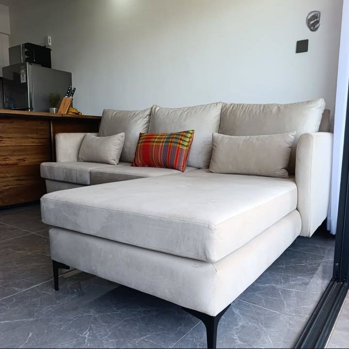 The Capri’s L-shaped layout makes it ideal for apartments, studios, and open-plan living rooms. A chaise extension invites you to stretch out for reading, lounging, or afternoon naps, while multiple back cushions and a lumbar support pillow add layers of comfort and style. The subtle neutral tone is complemented by a colorful accent pillow, introducing a pop of personality that enhances any décor.