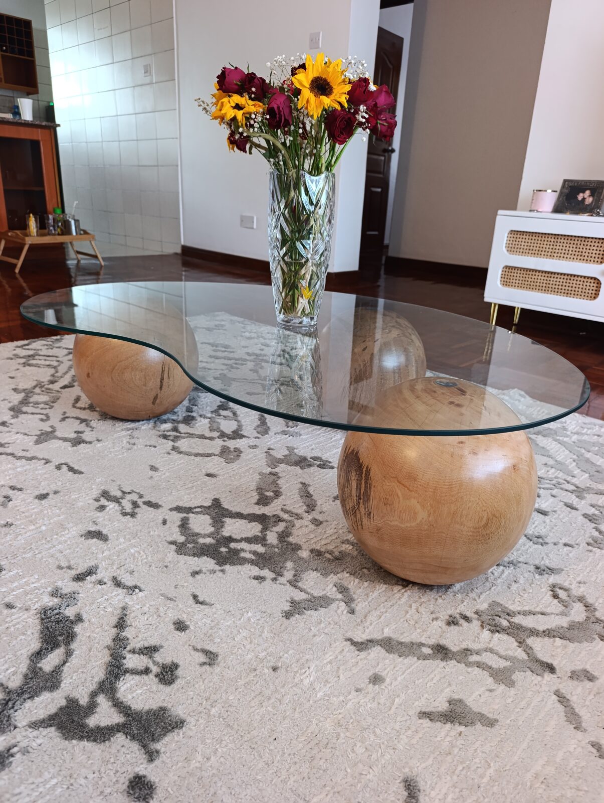 The transparent surface draws attention to the natural grain of the spherical bases, allowing their organic beauty to shine through. More than just a table, it’s a statement of refined taste — one that introduces flow, sophistication, and a touch of artistry to your home.