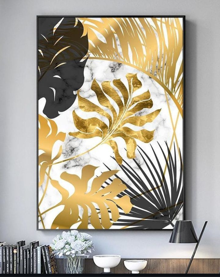 The Golden Tropic Luxe Wall Art infuses interiors with rich sophistication. Golden tropical leaves shimmer against deep marble-textured backgrounds, creating a striking focal point that evokes exotic elegance and contemporary luxury.