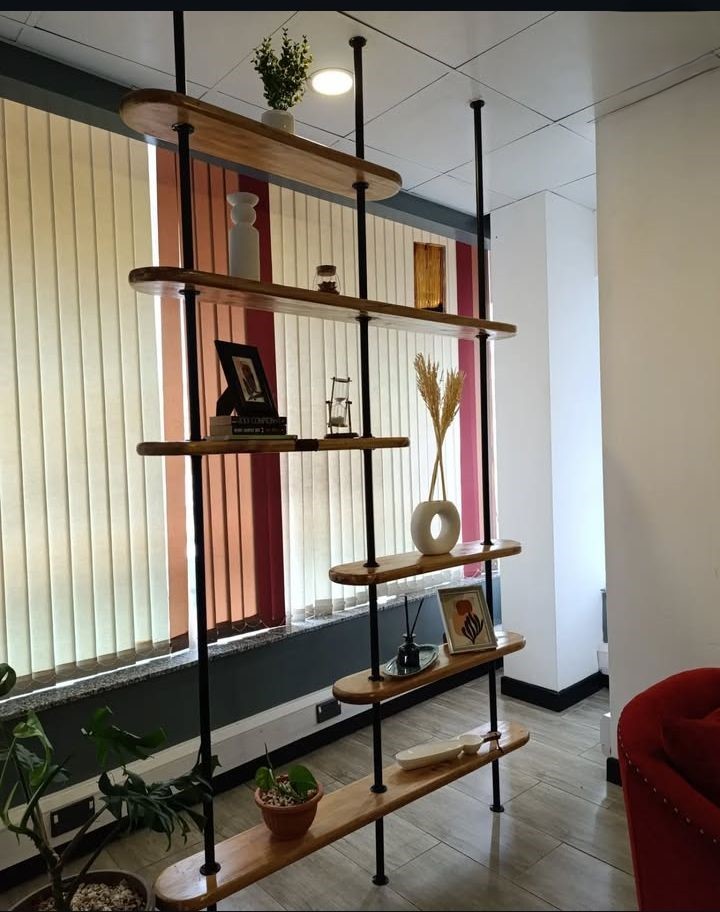 The Industrial Pole-Mounted Open Shelf is where raw industrial character meets natural warmth. Featuring sleek, floor-to-ceiling black metal poles paired with solid wood shelves in a polished natural finish, this shelving system offers a bold yet refined presence. Its airy, open design makes it the perfect platform to showcase books, greenery, art, and treasured accents — while doubling as a subtle room divider in modern open-plan spaces.